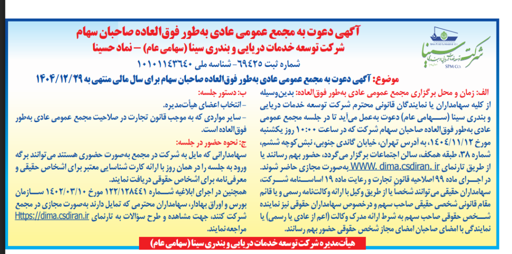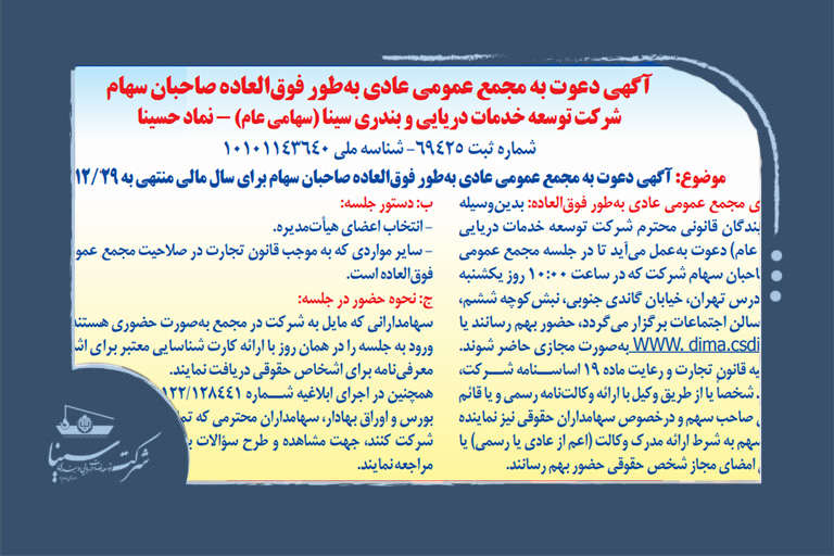 آگهی دعوت به مجمع عمومی عادی به طور فوق العاده صاحبان سهام (نماد حسینا)